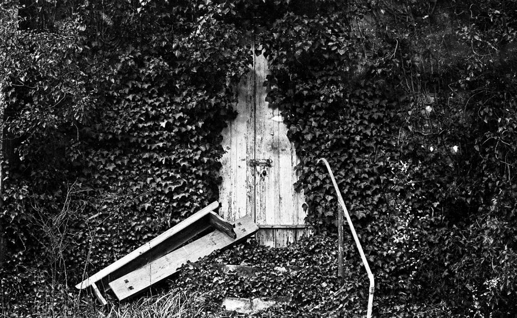 Abandoned church in North Adelaide. Natural elements have overtaken the architectural. However, the church pew and metal railing shout out, directing the viewer’s attention toward the church entrance.